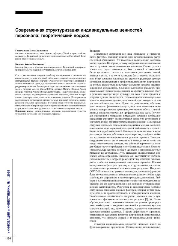 Головчанская, Е.Э. Современная структуризация индивидуальных ценностей персонала: теоретический подход / Е.Э. Головчанская, К.Н. Ващенко // Инновации и инвестиции. – 2025. – № 1. — С. 134-139. — Только в электронном виде. — <URL:http://elib.fa.ru/art2025/bv827.pdf>.
