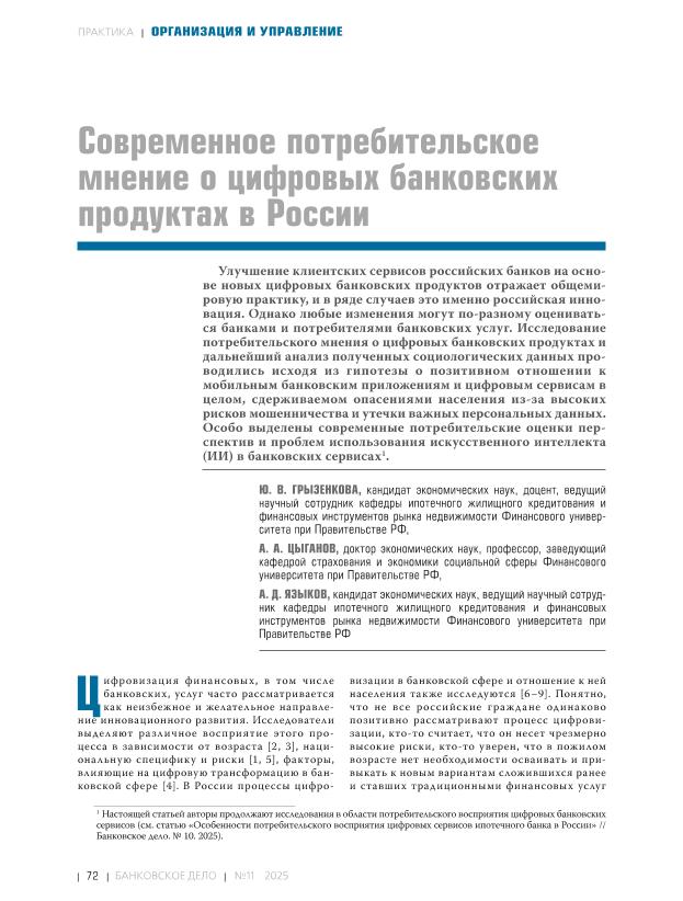 Грызенкова, Ю.В. Современное потребительское мнение о цифровых банковских продуктах в России / Ю.В. Грызенкова, А.А. Цыганов, А.Д. Языков // Банковское дело. – 2025. – № 11. — С. 72-78 — <URL:http://elib.fa.ru/art2025/bv828.pdf>.