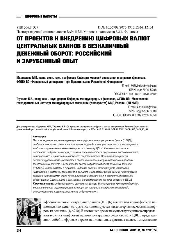 Медведева, М.Б. От проектов к внедрению цифровых валют центральных банков в безналичный денежный оборот: российский и зарубежный опыт / М.Б. Медведева, К.В. Трушина // Банковские услуги. – 2024. – № 12. — С. 34-44. — Только в электронном виде. — <URL:http://elib.fa.ru/art2024/bv3339.pdf>.