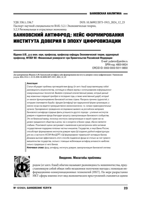 Юданов, А.Ю. Банковский антифрод: кейс формирования института доверия в эпоху цифровизации // Банковские услуги. – 2024. – № 12. — С. 23-33. — Только в электронном виде. — <URL:http://elib.fa.ru/art2024/bv3340.pdf>.