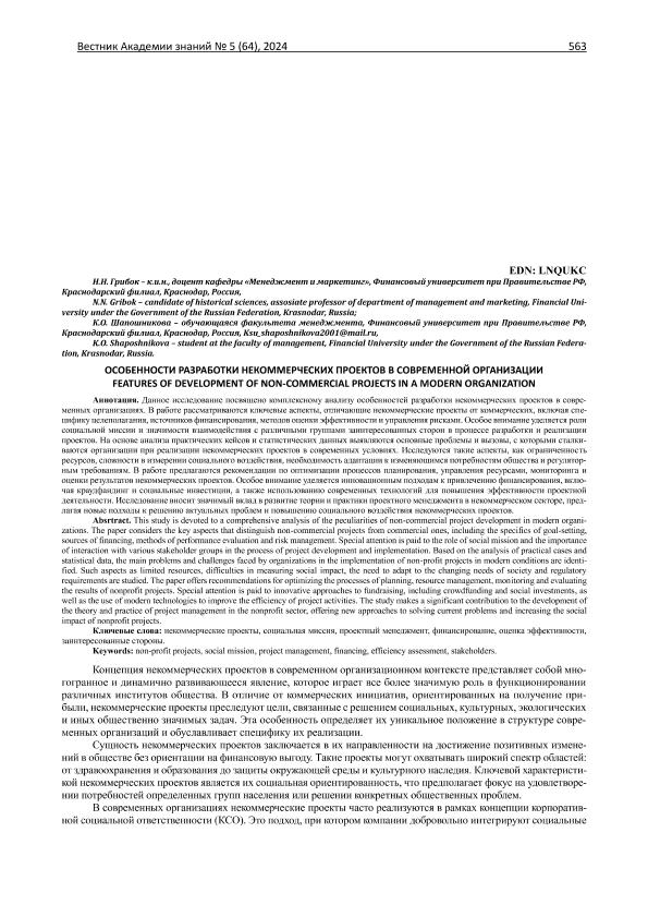 Грибок, Н.Н. Особенности разработки некоммерческих проектов в современной организации / Н.Н. Грибок, К.О. Шапошникова // Вестник Академии знаний. – 2024. – № 5. — С. 563-570. — Только в электронном виде. — <URL:http://elib.fa.ru/art2024/bv3341.pdf>.
