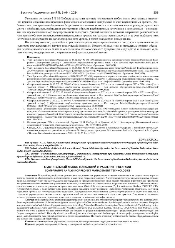 Грибок, Н.Н. Сравнительный анализ технологий управления проектами / Н.Н. Грибок, З.Х. Гиясова // Вестник Академии знаний. – 2024. – № 5. — С. 559-563. — Только в электронном виде. — <URL:http://elib.fa.ru/art2024/bv3342.pdf>.