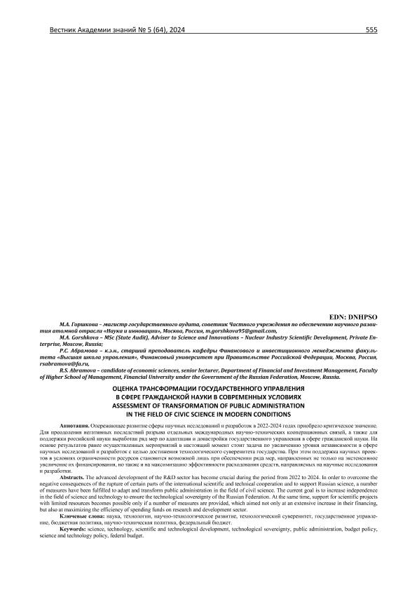 Горшкова, М.А. Оценка трансформации государственного управления в сфере гражданской науки в современных условиях / М.А. Горшкова, Р.С. Абрамова // Вестник Академии знаний. – 2024. – № 5. — С. 555-559. — Только в электронном виде. — <URL:http://elib.fa.ru/art2024/bv3343.pdf>.