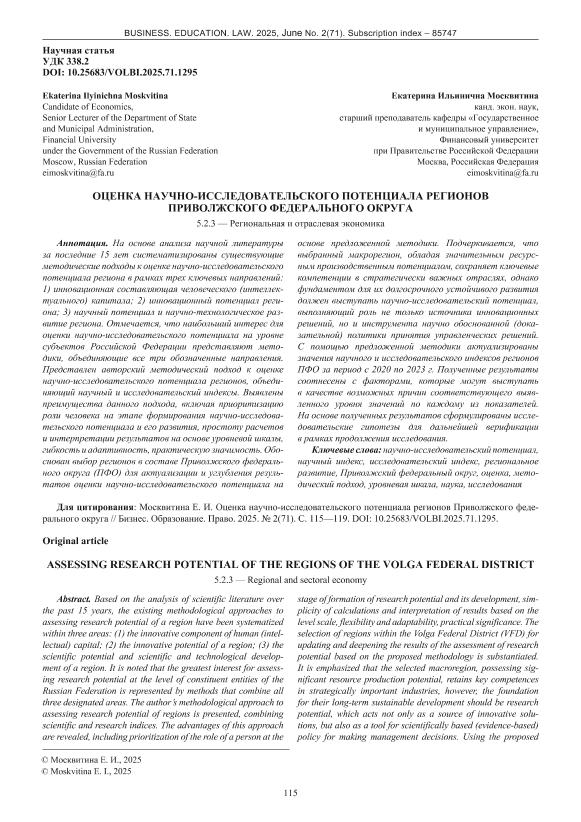 Москвитина, Е.И. Оценка научно-исследовательского потенциала регионов Приволжского федерального округа // Бизнес. Образование. Право. – 2025. – № 2. — С. 115-119. — Только в электронном виде. — <URL:http://elib.fa.ru/art2025/bv1028.pdf>.