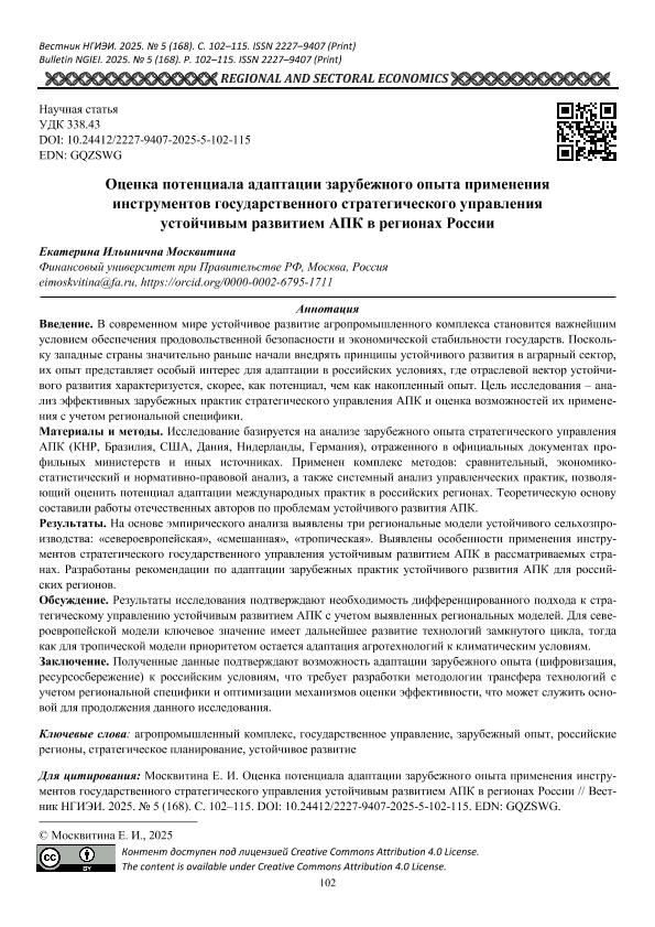 Москвитина, Е.И. Оценка потенциала адаптации зарубежного опыта применения инструментов государственного стратегического управления устойчивым развитием АПК в регионах России // Вестник НГИЭИ (Нижегородский государственный инженерно-экономический университет). – 2025. – № 5. — С. 102-115. — Только в электронном виде. — <URL:http://elib.fa.ru/art2025/bv1029.pdf>.