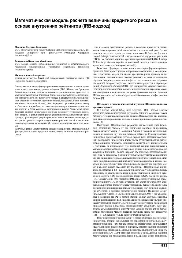 Муминова, С.Р. Математическая модель расчета величины кредитного риска на основе внутренних рейтингов (IRB-подход) / С.Р. Муминова, В.М. Феоктистова, А.А. Малышев // Экономика строительства. – 2025. – № 4. — С. 533-535. — Только в электронном виде. — <URL:http://elib.fa.ru/art2025/bv1030.pdf>.