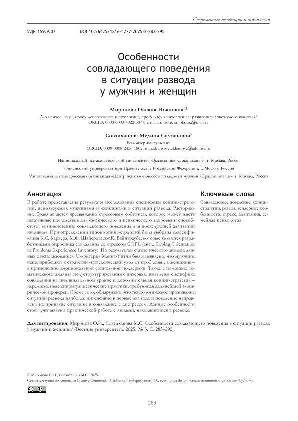 Миронова, О.И. Особенности совладающего поведения в ситуации развода у мужчин и женщин / О.И. Миронова, М.С. Совзиханова // Вестник университета. – 2025. – № 3. — С. 283-295. — Только в электронном виде. — <URL:http://elib.fa.ru/art2025/bv1422.pdf>.