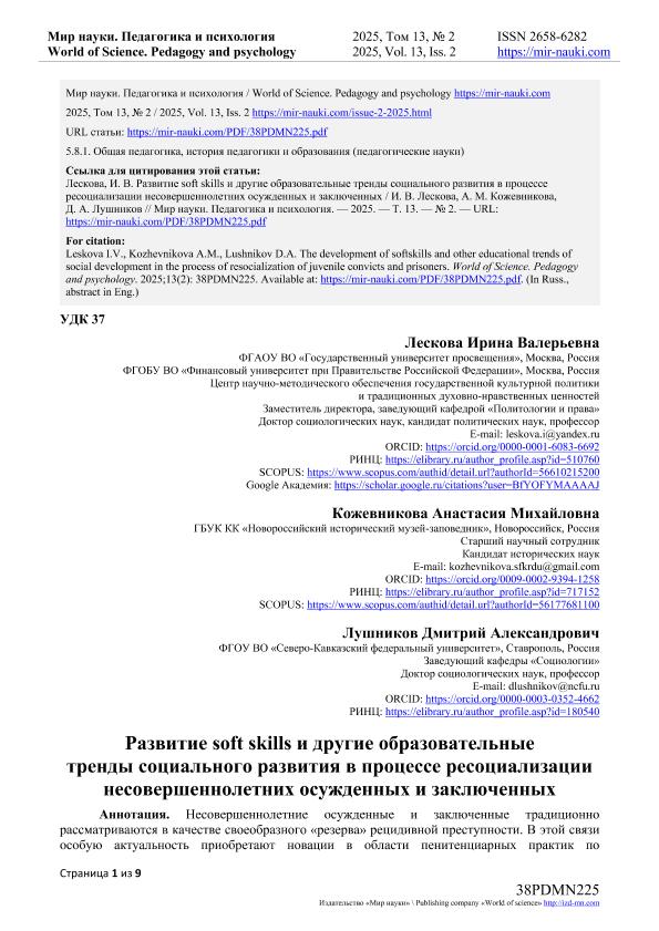Лескова, И.В. Развитие soft skills и другие образовательные тренды социального развития в процессе ресоциализации несовершеннолетних осужденных и заключенных / И.В. Лескова, А.М. Кожевникова, Д.А. Лушников. — Текст: электронный // Мир науки. Педагогика и психология. – 2025. – № 2. — URL: https://mir-nauki.com/PDF/38PDMN225.pdf (дата обращения: 09.02.2026) — <URL:http://elib.fa.ru/art2025/bv1885.pdf>.