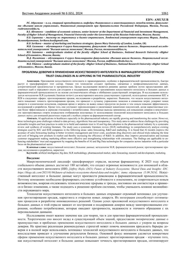 Проблемы доверия в применении искусственного интеллекта в фармацевтической отрасли / Р.С. Абрамова, К.О. Серикова, М.В. Сазонова, М.Д. Филатова // Вестник Академии знаний. – 2024. – № 6. — С. 1061-1068. — Только в электронном виде. — <URL:http://elib.fa.ru/art2024/bv3468.pdf>.