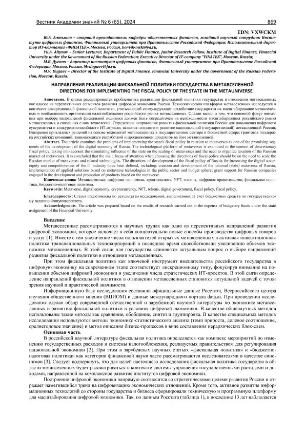 Алтынов, Ю.А. Направления реализации фискальной политики государства в метавселенной / Ю.А. Алтынов, М.В. Дугаев // Вестник Академии знаний. – 2024. – № 6. — С. 869-873. — Только в электронном виде. — <URL:http://elib.fa.ru/art2024/bv3469.pdf>.