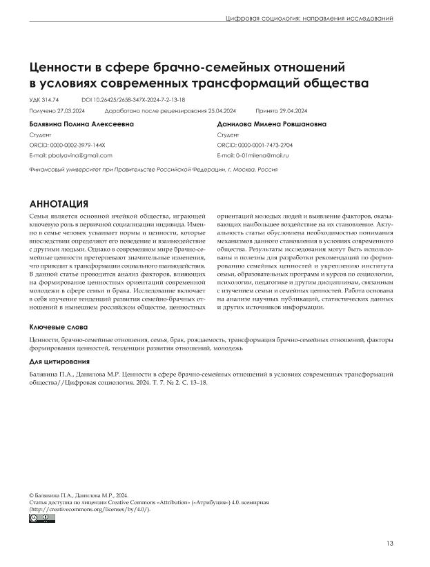 Балявина, П.А. Ценности в сфере брачно-семейных отношений в условиях современных трансформаций