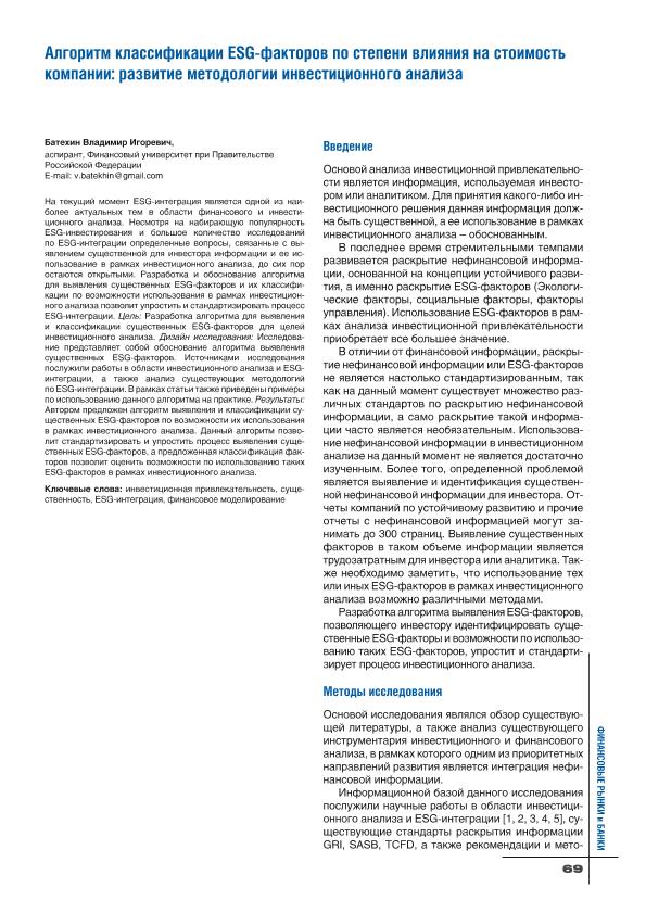 Батехин, В.И. Алгоритм классификации ESG-факторов по степени влияния на стоимость компании: развитие методологии инвестиционного анализа // Финансовые рынки и банки. – 2024. – № 1. — С. 69-74. — Только в электронном виде. — <URL:http://elib.fa.ru/art2024/bv2750.pdf>.