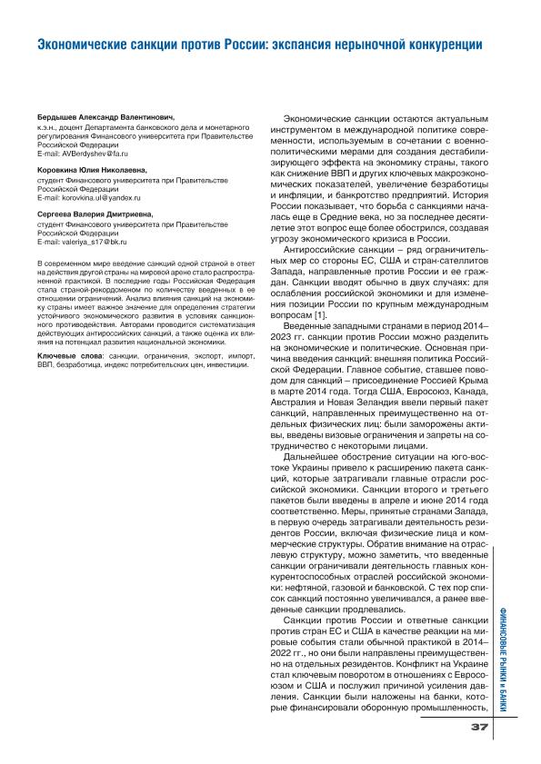 Бердышев, А.В. Экономические санкции против России: экспансия нерыночной конкуренции / А.В. Бердышев, Ю.Н. Коровкина, В.Д. Сергеева // Финансовые рынки и банки. – 2024. – № 1. — С. 37-41. — Только в электронном виде. — <URL:http://elib.fa.ru/art2024/bv2751.pdf>.