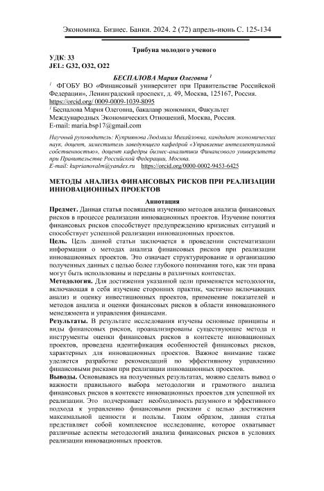 Беспалова, М.О. Методы анализа финансовых рисков при реализации инновационных проектов // Экономика. Бизнес. Банки. – 2024. – № 2. — С. 125-134. — Только в электронном виде. — <URL:http://elib.fa.ru/art2024/bv2752.pdf>.