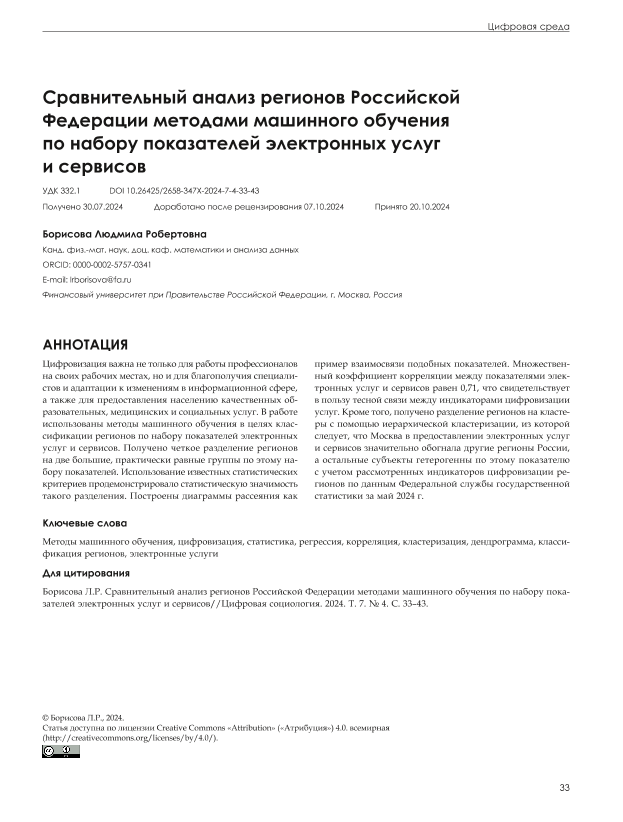 Борисова, Л.Р. Сравнительный анализ регионов Российской Федерации методами машинного обучения по набору показателей электронных услуг и сервисов // Цифровая социология. – 2024. – № 4. — С. 33-43. — Только в электронном виде. — <URL:http://elib.fa.ru/art2024/bv2753.pdf>.