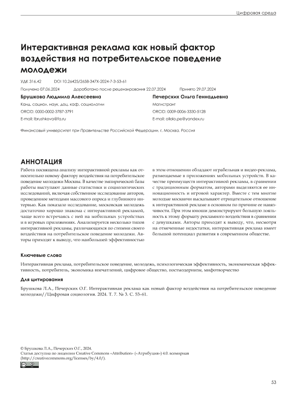 молодежи / Л.А. Брушкова, О.Г. Печерских // Цифровая социология. – 2024. – № 3. — С. 53-61. — Только в электронном виде. — <URL:http://elib.fa.ru/art2024/bv2754.pdf>.