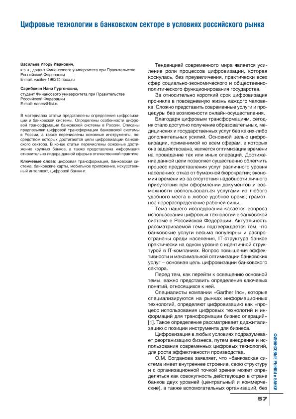 Васильев, И.И. Цифровые технологии в банковском секторе в условиях российского рынка / И.И. Васильев, Н.Г. Сарибекян // Финансовые рынки и банки. – 2024. – № 1. — С. 57-62. — Только в электронном виде. — <URL:http://elib.fa.ru/art2024/bv2755.pdf>.