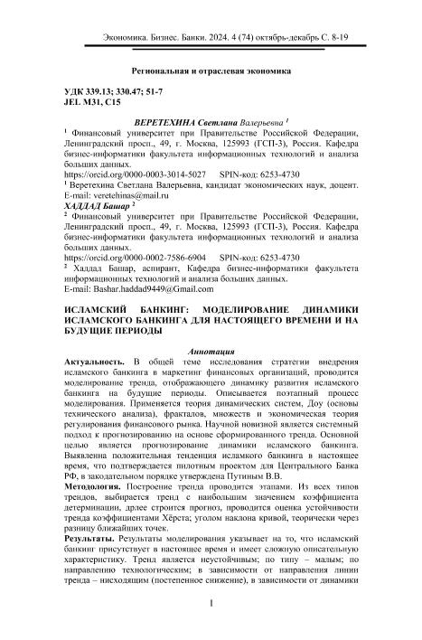 Веретехина, С.В. Исламский банкинг: моделирование динамики исламского банкинга для настоящего времени и на будущие периоды / С.В. Веретехина, Б. Хаддад // Экономика. Бизнес. Банки. – 2024. – № 4. — С. 8-19. — Только в электронном виде. — <URL:http://elib.fa.ru/art2024/bv2756.pdf>.