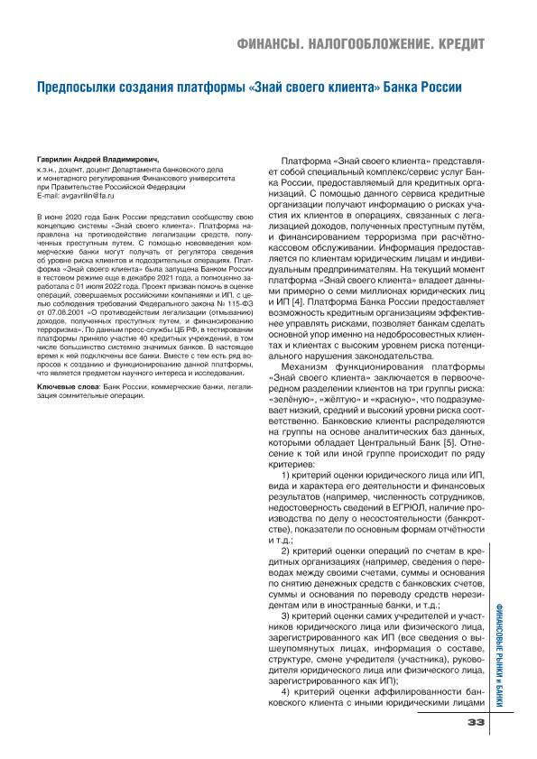 Гаврилин, А.В. Предпосылки создания платформы «Знай своего клиента» Банка России // Финансовые рынки и банки. – 2024. – № 1. — С. 33-36. — Только в электронном виде. — <URL:http://elib.fa.ru/art2024/bv2757.pdf>.