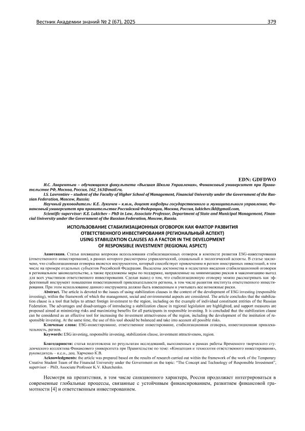 Лаврентьев, И.С. Использование стабилизационных оговорок как фактор развития ответственного инвестирования (региональный аспект) // Вестник Академии знаний. – 2025. – № 2. — С. 379-381. — Только в электронном виде. — <URL:http://elib.fa.ru/art2025/bv872.pdf>.