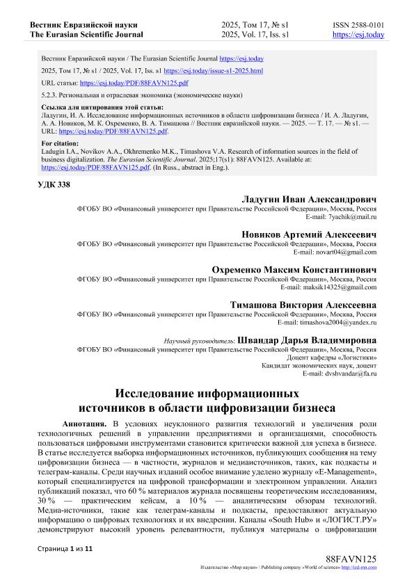 Исследование информационных источников в области цифровизации бизнеса / И.А. Ладугин, А.А. Новиков, М.К. Охременко, В.А. Тимашова. — Текст: электронный // Вестник Евразийской науки. – 2025. – № s1. — URL: https://esj.today/PDF/88FAVN125.pdf (дата обращения: 25.09.2025) — <URL:http://elib.fa.ru/art2025/bv873.pdf>.