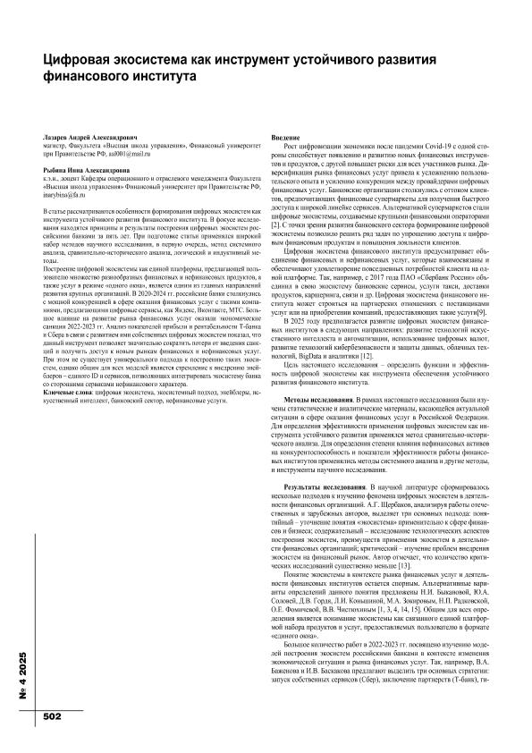 Лазарев, А.А. Цифровая экосистема как инструмент устойчивого развития финансового института / А.А. Лазарев, И.А. Рыбина // Экономика строительства. – 2025. – № 4. — С. 502-504. — Только в электронном виде. — <URL:http://elib.fa.ru/art2025/bv874.pdf>.