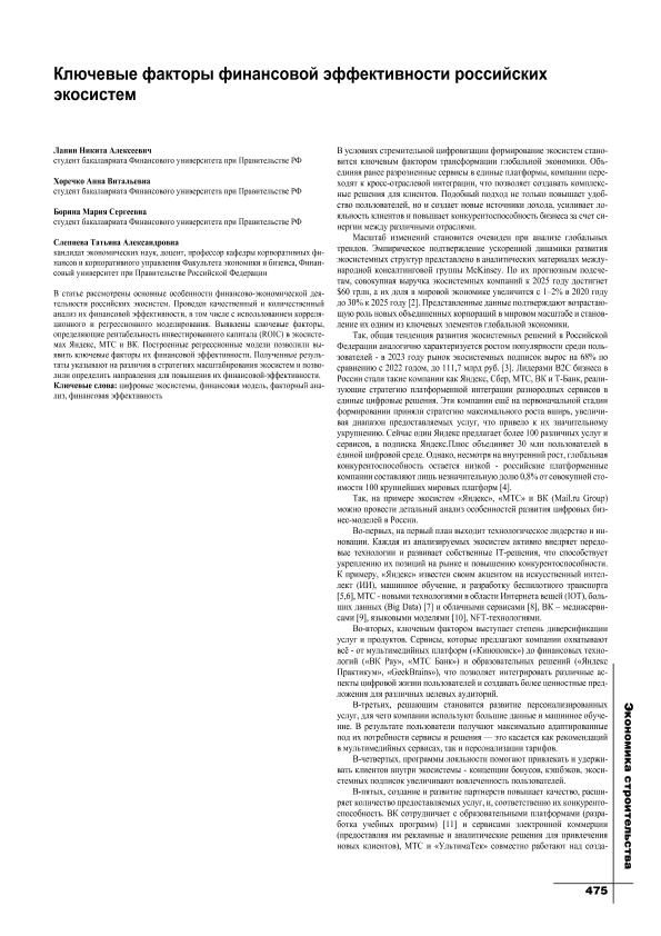 Ключевые факторы финансовой эффективности российских экосистем / Н.А. Лапин, А.В. Хоречко, М.С. Борина, Т.А. Слепнева // Экономика строительства. – 2025. – № 4. — С. 475-479. — Только в электронном виде. — <URL:http://elib.fa.ru/art2025/bv875.pdf>.