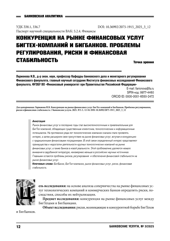 Ларионова, И.В. Конкуренция на рынке финансовых услуг БигТех-компаний и БигБанков. Проблемы регулирования, риски и финансовая стабильность // Банковские услуги. – 2025. – № 3. — С. 12-18. — Только в электронном виде. — <URL:http://elib.fa.ru/art2025/bv876.pdf>.