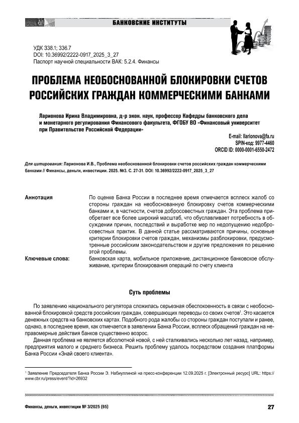 Ларионова, И.В. Проблема необоснованной блокировки счетов российских граждан коммерческими банками // Финансы, деньги, инвестиции. – 2025. – № 3. — С. 27-31 — <URL:http://elib.fa.ru/art2025/bv877.pdf>.