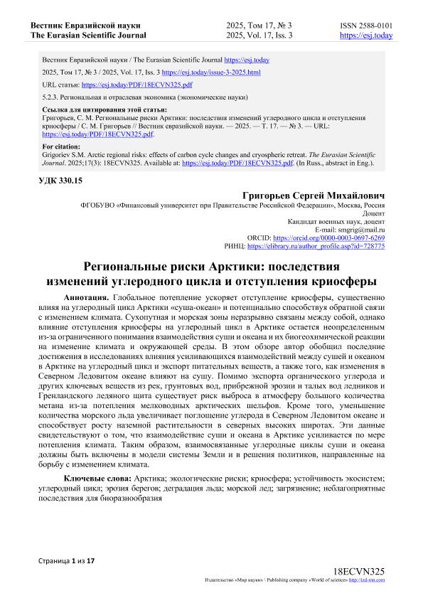 Григорьев, С.М. Региональные риски Арктики: последствия изменений углеродного цикла и отступления криосферы. — Текст: электронный // Вестник Евразийской науки. – 2025. – № 3. — URL: https://esj.today/PDF/18ECVN325.pdf (дата обращения: 01.12.2025) — <URL:http://elib.fa.ru/art2025/bv878.pdf>.
