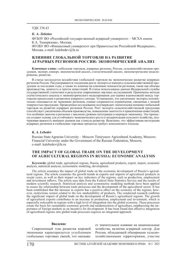 Лебедев, К.А. Влияние глобальной торговли на развитие аграрных регионов России: экономический анализ // Вестник Алтайской академии экономики и права. – 2025. – № 5-1. — С. 170-174. — Только в электронном виде. — <URL:http://elib.fa.ru/art2025/bv879.pdf>.