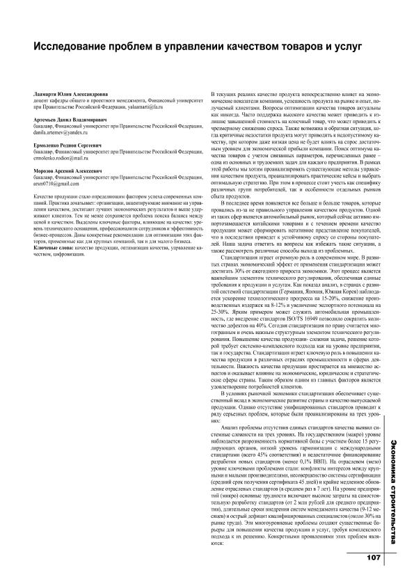 Исследование проблем в управлении качеством товаров и услуг / Ю.А. Лаамарти, Д.В. Артемьев, Р.С. Ермоленко, А.А. Морозов // Экономика строительства. – 2025. – № 5. — С. 107-111. — Только в электронном виде. — <URL:http://elib.fa.ru/art2025/bv902.pdf>.