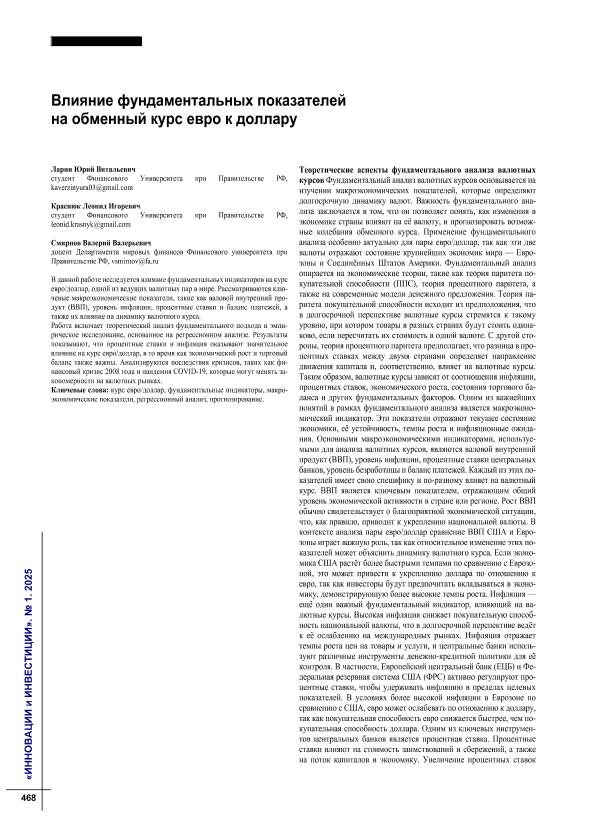 на обменный курс евро к доллару / Ю.В. Ларин, Л.И. Краснюк, В.В. Смирнов // Инновации и инвестиции. – 2025. – № 1. — С. 468-473. — Только в электронном виде. — <URL:http://elib.fa.ru/art2025/bv903.pdf>.