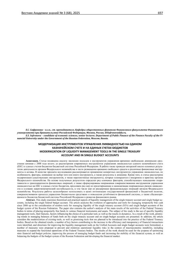 Сафронова, Е.С. Модернизация инструментов управления ликвидностью на Едином казначейском счете и на единых счетах бюджетов // Вестник Академии знаний. – 2025. – № 3. — С. 697-707. — Только в электронном виде. — <URL:http://elib.fa.ru/art2025/bv1569.pdf>.