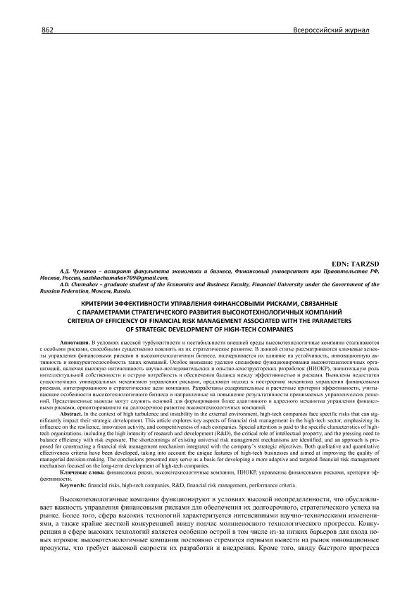 Чумаков, А.Д. Критерии эффективности управления финансовыми рисками, связанные с параметрами стратегического развития высокотехнологичных компаний // Вестник Академии знаний. – 2025. – № 2. — С. 862-866. — Только в электронном виде. — <URL:http://elib.fa.ru/art2025/bv1610.pdf>.
