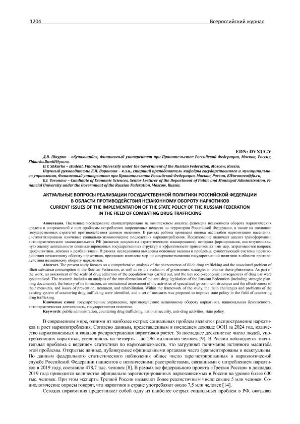 Шкурко, Д.В. Актуальные вопросы реализации государственной политики Российской Федерации в области противодействия незаконному обороту наркотиков // Вестник Академии знаний. – 2025. – № 2. — С. 1204-1208. — Только в электронном виде. — <URL:http://elib.fa.ru/art2025/bv1626.pdf>.