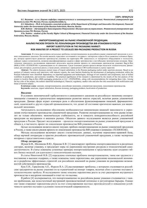 Якушова, Е.С. Импортозамещение на рынке упаковочной продукции: анализ рисков проекта по локализации производства BiB-упаковки в России / Е.С. Якушова, В.Ю. Надеин // Вестник Академии знаний. – 2025. – № 2. — С. 671-675. — Только в электронном виде. — <URL:http://elib.fa.ru/art2025/bv1644.pdf>.