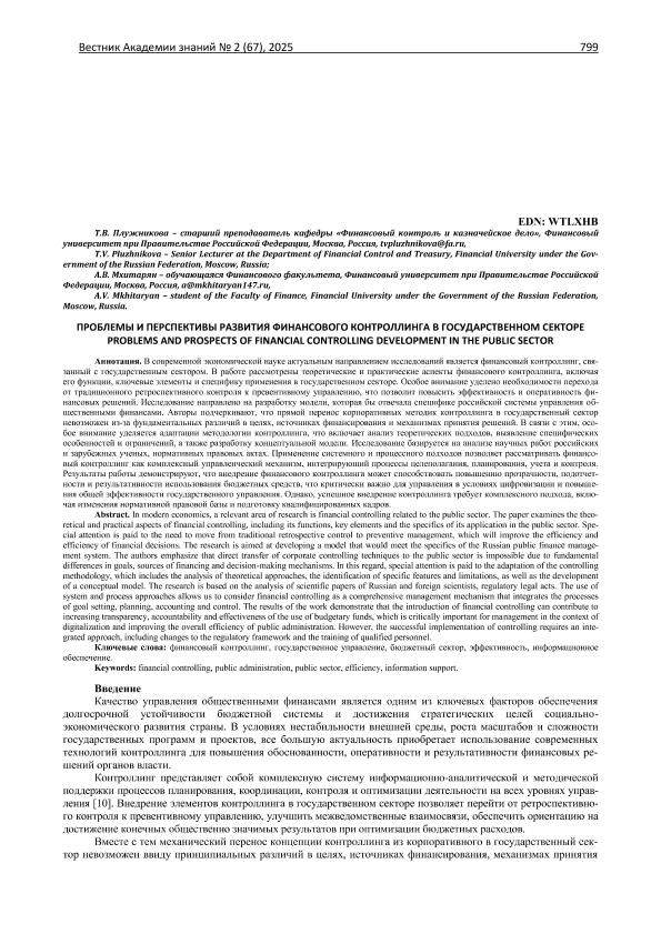 Плужникова, Т.В. Проблемы и перспективы развития финансового контроллинга в государственном секторе / Т.В. Плужникова, А.В. Мхитарян // Вестник Академии знаний. – 2025. – № 2. — С. 799-804. — Только в электронном виде. — <URL:http://elib.fa.ru/art2025/bv1529.pdf>.