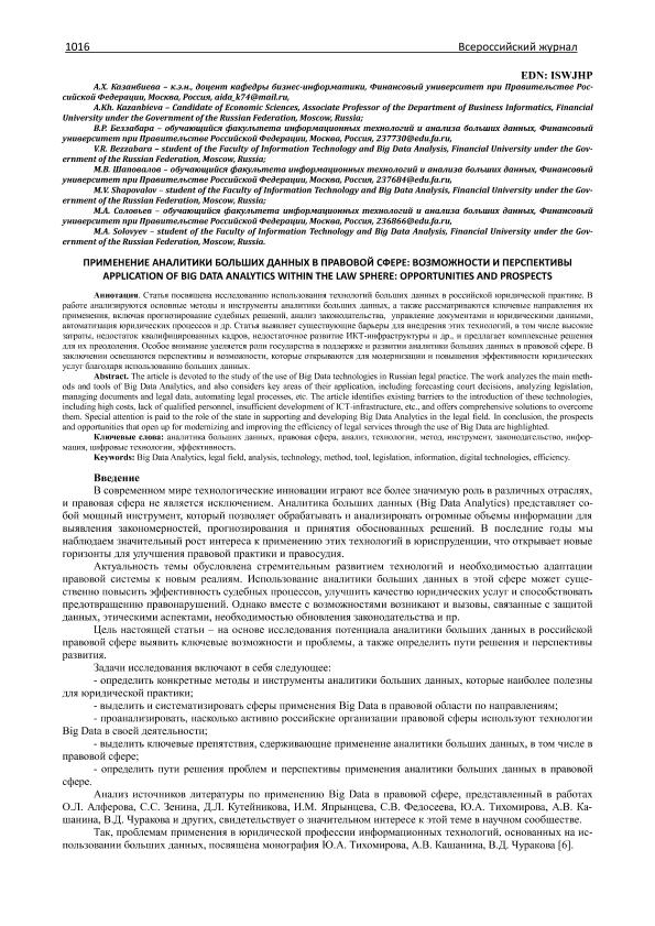Применение аналитики больших данных в правовой сфере: возможности и перспективы / А.Х. Казанбиева, В.Р. Беззабара, М.В. Шаповалов, М.А. Соловьев // Вестник Академии знаний. – 2025. – № 2. — С. 1016-1023. — Только в электронном виде. — <URL:http://elib.fa.ru/art2025/bv1543.pdf>.
