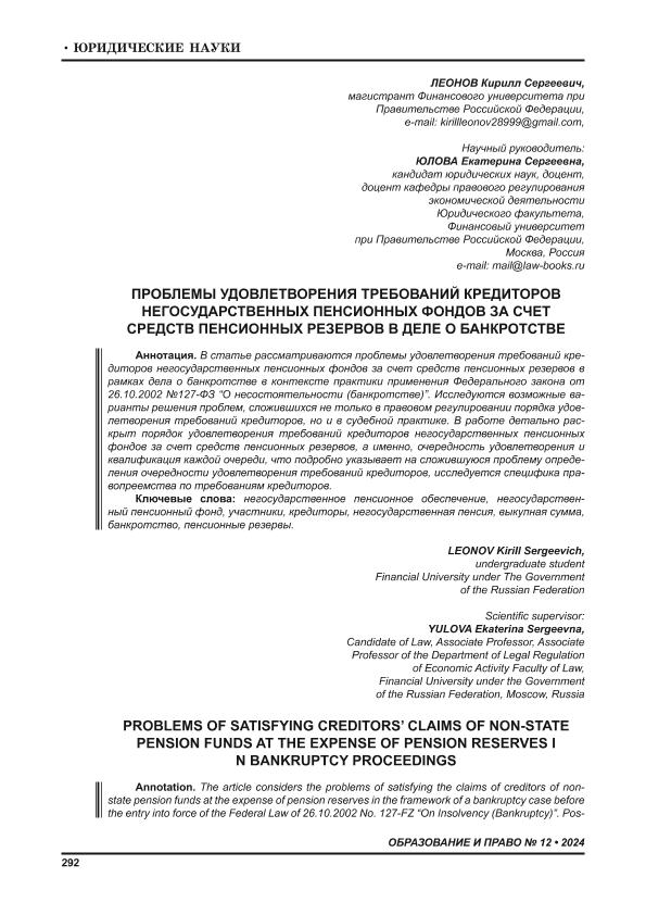 РФ; магистранты ФА; полный текст; правовое регулирование; законодательство; банкротство; кредитование; банковский кредит; кредитор; пенсии; пенсионное обеспечение; негосударственные пенсионные фонды; участники; негосударственная пенсия; выкупная сумма; пенсионные резервы; требования; судебная практика; договорные отношения