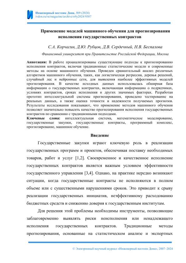 интеллектуальные системы; машинное обучение; математические модели; исполнение договора; оценка риска; государственные контракты; государственные закупки; прогнозирование; сравнительный анализ; государственное управление; электронные публикации; полный текст
