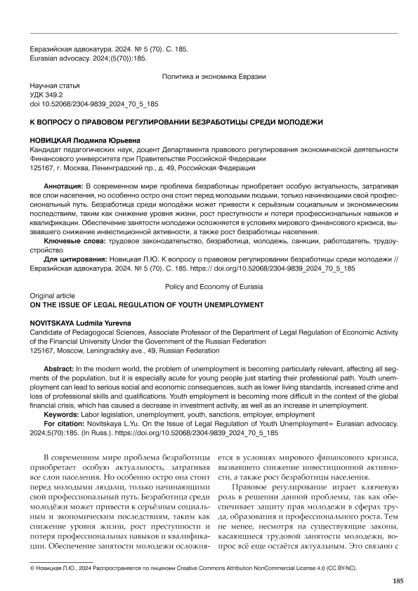 РФ; безработица; молодежь; санкции; трудовое законодательство; работодатели; трудоустройство; занятость; молодые специалисты; правовое регулирование; нормативные правовые акты; комплексный подход; государственная поддержка; молодежное предпринимательство; полный текст