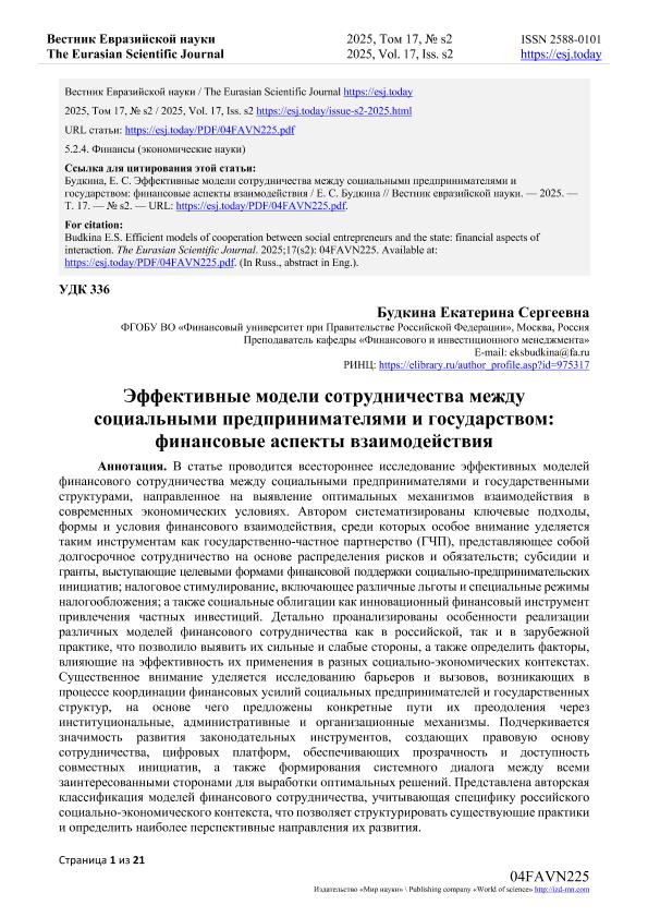 Subjects: РФ; социальное предпринимательство; финансовое сотрудничество; государственно-частное партнерство; гранты; налоговое стимулирование; социальные облигации; устойчивое развитие; государственная поддержка; модели; классификация; барьеры; цифровые технологии; инновации; финансовые инструменты; социальная эффективность; концептуальный анализ; сравнительный анализ; мировой опыт; межсекторное взаимодействие; электронные публикации; полный текст