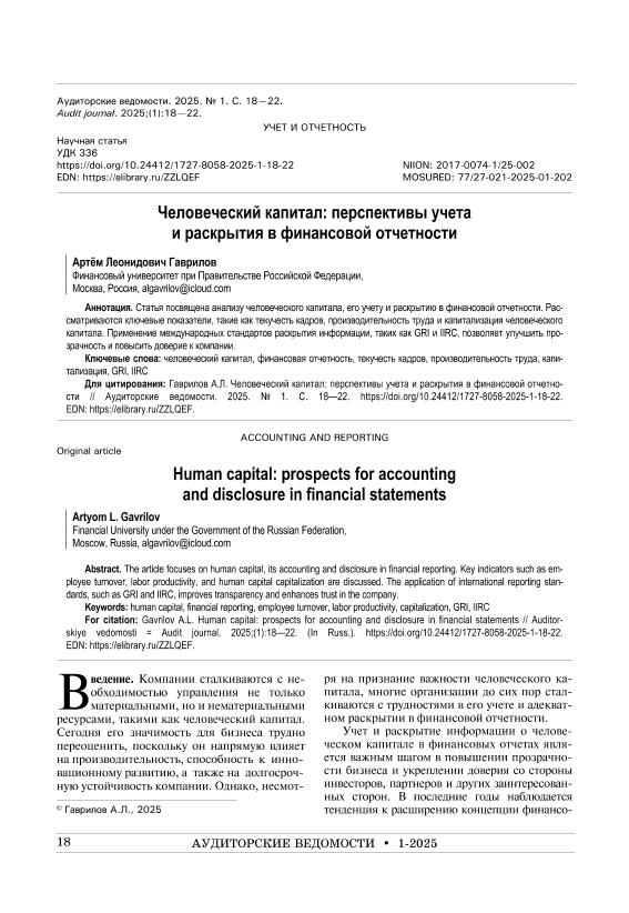 РФ; человеческий капитал; перспективы учета; учет; раскрытие информации; финансовая отчетность; показатели; текучесть; производительность труда; капитализация; кадры; международные стандарты; GRI; IIRC; студенты ФА; полный текст