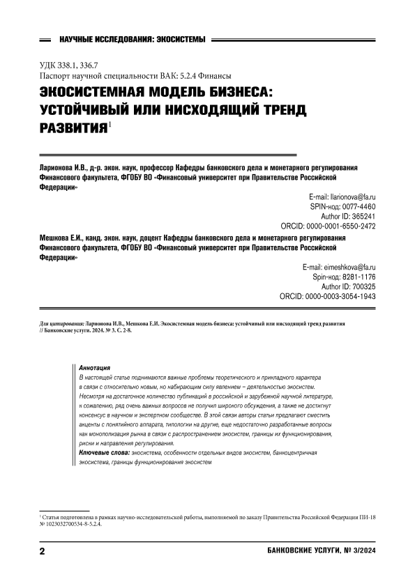 Subjects: РФ; экосистемная модель; бизнес; предпринимательство; тренд развития; экосистема; особенности отдельных видов экосистем; границы функционирования экосистем; концепции науки; капитализация; риски; регулирование экосистем; анализ динамики; статистические данные; полный текст