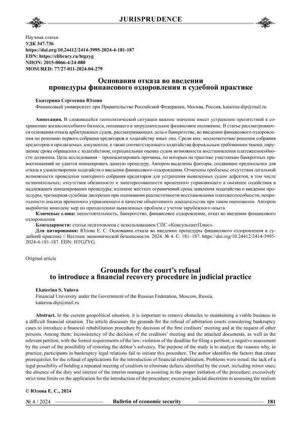 Юлова, Е.С. Основания отказа во введении процедуры финансового оздоровления в судебной практике // Вестник экономической безопасности. – 2024. – № 4. — С. 181-187. — Только в электронном виде. — <URL:http://elib.fa.ru/art2024/bv3528.pdf>.