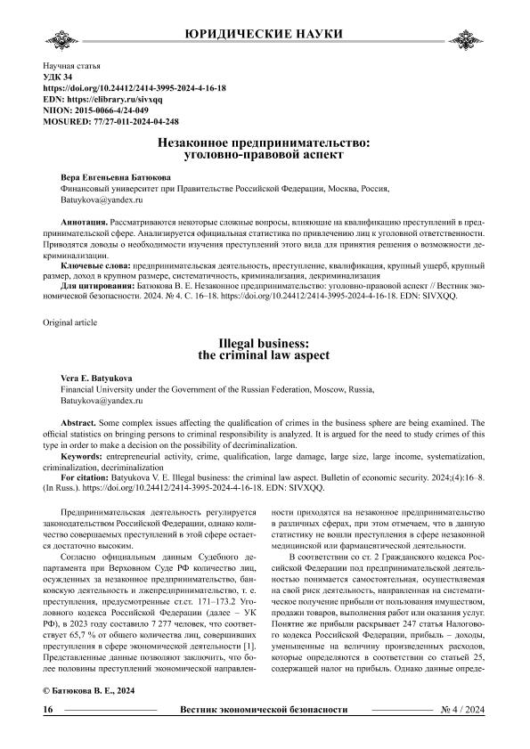 Батюкова, В.Е. Незаконное предпринимательство: уголовно-правовой аспект // Вестник экономической безопасности. – 2024. – № 4. — С. 16-18. — Только в электронном виде. — <URL:http://elib.fa.ru/art2024/bv3529.pdf>.