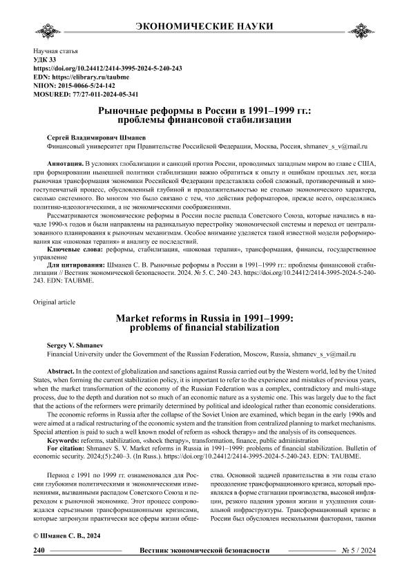 Шманев, С.В. Рыночные реформы в России в 1991‒1999 гг.: проблемы финансовой стабилизации // Вестник экономической безопасности. – 2024. – № 5. — С. 240-243. — Только в электронном виде. — <URL:http://elib.fa.ru/art2024/bv3530.pdf>.