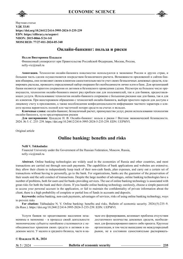 Цхададзе, Н.В. Онлайн-банкинг: польза и риски // Вестник экономической безопасности. – 2024. – № 5. — С. 235-239. — Только в электронном виде. — <URL:http://elib.fa.ru/art2024/bv3531.pdf>.