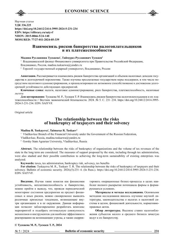 Тускаева, М.Р. Взаимосвязь рисков банкротства налогоплательщиков и их платежеспособности / М.Р. Тускаева, Т.Р. Тускаев // Вестник экономической безопасности. – 2024. – № 5. — С. 231-234. — Только в электронном виде. — <URL:http://elib.fa.ru/art2024/bv3532.pdf>.